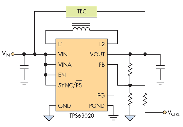 圖1中的電源是可以為低功率TEC提供和吸收電流的電路。例如,使用降壓/升壓轉換器(例如TPS63020)對提供的輸入電壓進行降壓或升壓,以生成所需的電流方向。降壓-升壓轉換器的拓撲支持較寬的輸出電壓范圍,在這種情況下為1.2至5.5V。