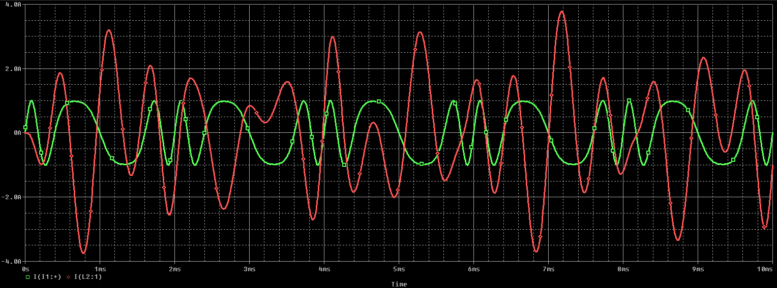 下圖顯示了一個簡單的瞬態分析,它比較了源電流波形(綠色)和負載電流(紅色)。我們可以看到瞬態響應在前約1 ms內消失,并且負載處的波形在以后的所有時間都保持一致。顯然,信號電平會有所衰減,但這主要是由于Pi網絡和負載的綜合阻抗,而不僅僅是負載本身。