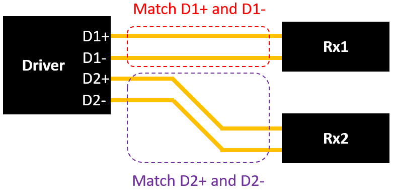 上面顯示的差分對在單個驅動器(例如,FPGA)和兩個不同的接收器之間路由。每個接收器分別讀取D1和D2上的差分信號。在此,差分對D1的每一端都需要進行長度匹配。類似地,差分對D2的每一端都需要長度匹配。但是, D1和D2不需要彼此匹配,因為它們沒有并行傳輸數據。這些差分對中的每對一次只傳送一個比特,我們只需要進行長度匹配以確保在每對中消除共模噪聲。