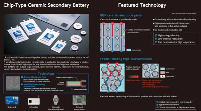 EnerCera有兩種類型:“ EnerCera Coin”,一種厚度為1毫米至2毫米的硬幣型電池,用于安裝在電路板上;“ EnerCera Pouch”,一種超薄且可彎曲的電池,厚度為0.4毫米至0.45毫米,用于嵌入卡。EnerCera硬幣是通過向其帶有電極和隔板的全陶瓷堆疊式整體中添加少量液體電解質(zhì)制成的。NGK將這些獨特的電池定義為“半固態(tài)電池”。他們?nèi)〉昧耸澜缟系谝粋€工作溫度為85°C的鋰離子二次電池,使用壽命長達10年,這是對物聯(lián)網(wǎng)設備的兩個很大要求。