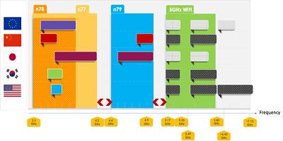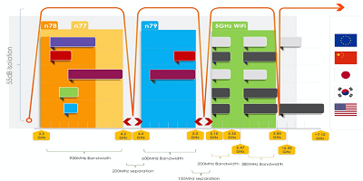 行業(yè)分析公司Navian的一份報告總結(jié)了這種共存問題:“ Wi-Fi的5 GHz頻段對智能手機至關(guān)重要,它位于4.5 GHz和6至7 GHz頻段之間。如果要充分利用這些頻率,則每個帶寬都需要一個陡峭的濾波器。同樣,對于n77和n79 5G頻段,由于200 MHz的頻段間隙太窄而無法充分利用,因此同時需要用于這些頻段的高性能濾波器。”