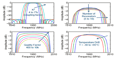 6.濾波器性能受耦合系數(shù)(較高的耦合會增加帶寬;左上方),諧振器的數(shù)量(增加諧振器的數(shù)量會增加帶寬而以損失為代價;右上方),品質(zhì)因數(shù)(較高的品質(zhì)因數(shù)會降低損耗,尤其是在波段邊緣;左下方)和溫度穩(wěn)定性(右下方)。