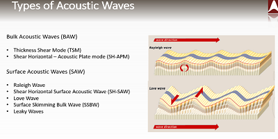 交替發(fā)生的機械變形會產(chǎn)生聲波,并以每秒4,000至12,000米的速度傳播。取決于金屬-壓電結(jié)構(gòu)的細節(jié),聲波可被引發(fā)以在表面上流動或通過壓電體。實際上,即使在表面聲波(SAW)和體聲波(BAW)類別中,也存在一系列具有不同特性的聲波 (圖4)。