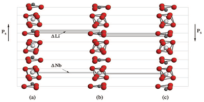 由于結(jié)構(gòu)內(nèi)的不對稱性,壓電效應(yīng)存在于某些晶體中。例如,在圖3所示的鈮酸鋰(LiNbO 3)晶格中,鋰和鈮離子從氧八面體的中心移位。