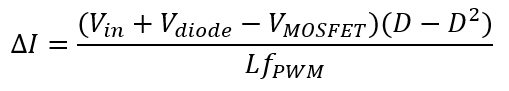 電感器的合適值取決于設計可承受的所需紋波電流,以及計劃用于PWM信號的占空比。下式顯示了輸出電壓隨二極管正向壓降和MOSFET導通狀態壓降的關系。考慮這些電壓后,輸出電壓為: