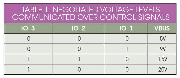 在這種方法中,芯片檢測并與設(shè)備協(xié)商功率,并通過控制信號傳達(dá)協(xié)商的功率水平。協(xié)商的電源可以為5、9、15或20 V (表1)。該芯片還實(shí)現(xiàn)了進(jìn)出電池組的電源路徑。
