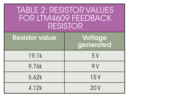 電阻器網(wǎng)絡(luò)的作用是從USB Type-C PD芯片獲取控制信號,并為穩(wěn)壓器的反饋電阻器創(chuàng)建等效電阻。例如,假設(shè)您使用LTM4609降壓-升壓型穩(wěn)壓器作為標(biāo)稱電壓為16 V的電池組中的穩(wěn)壓器。表2列出了電阻網(wǎng)絡(luò)必須為穩(wěn)壓器的反饋電阻生成的電阻值。