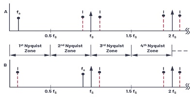 奈奎斯特帶寬定義為從直流到fS / 2的頻譜。頻譜被劃分為無數個奈奎斯特區,每個區的寬度等于0.5fS。實際上,理想的采樣器由ADC和FFT處理器代替。FFT處理器僅提供從直流到fS / 2的輸出;也就是說,出現在第一個奈奎斯特區域中的信號或別名。