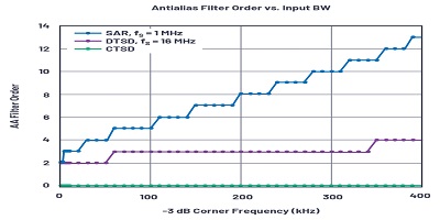 如果選擇400 kSPS的采樣速度來放寬濾波器的階數,則對于> 300 kHz的輸入頻率,則需要抑制。增加采樣速度將增加功率,對于雙倍速度,功率也將增加一倍。由于采樣頻率遠高于輸入帶寬,因此,以功率為代價的進一步過采樣將進一步放寬抗混疊濾波器的要求。