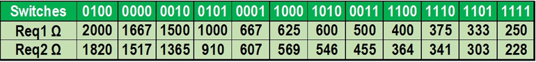 對于BANK2 : 對于R1 = R2 = R4 = R5 = 910Ω,且R 3 = 1100Ω,對于1100的第一組合 à 364Ω 和1001交替組合 à 371Ω; 為1101的第一組合 à 303.3Ω和1011交替組合 à 321.9Ω。