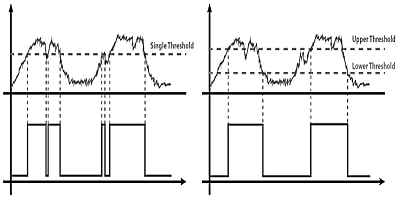 比較器輸出無遲滯(左)和有遲滯(右)