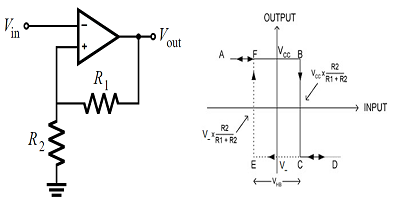 由運算放大器構建的比較器電路,具有高增益的正反饋環路可確保一旦輸入電壓高于或低于0 V,輸出就會在電源軌上飽和