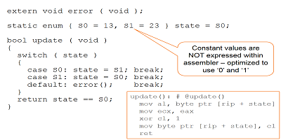 編譯器還決定,由于實際對象(13和23)的值未在數字上下文中使用,因此它將僅使用0和1的值在狀態之間切換,然后使用異或“或”更新狀態值。二進制文件遵循“好像”義務,并且代碼快速緊湊。在其職權范圍內,編譯器做得很好。