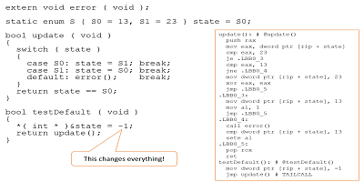僅在初始化“ state”對象時以及在“ S0”和“ S1”情況下修改“ state”對象,因此編譯器可以推斷出賦予“ state”的唯一值是“ S0”和“ S1”。編譯器得出結論,不需要“默認值”,因為假設沒有損壞,“狀態”將永遠不包含任何其他值-實際上,編譯器所做的正是這一假設。