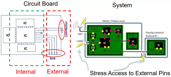 該圖顯示了可能發生系統級ESD的位置。暴露的IO和連接器是ESD事件可以將電脈沖傳播到系統中并可能損壞組件的明顯位置。