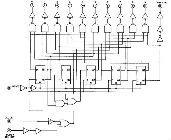 這可能還不清楚,但是如果您看一下CD4017 IC的內部結構,就會發現它實際上是使用與門,或非門,反相器,觸發器和緩沖器構造的。
