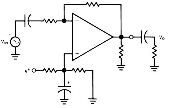 這是使用運算放大器,電阻器和電容器實現的簡單放大器電路。通過為電阻器和電容器選擇合適的值,可以在輸出端獲得顯著的增益。